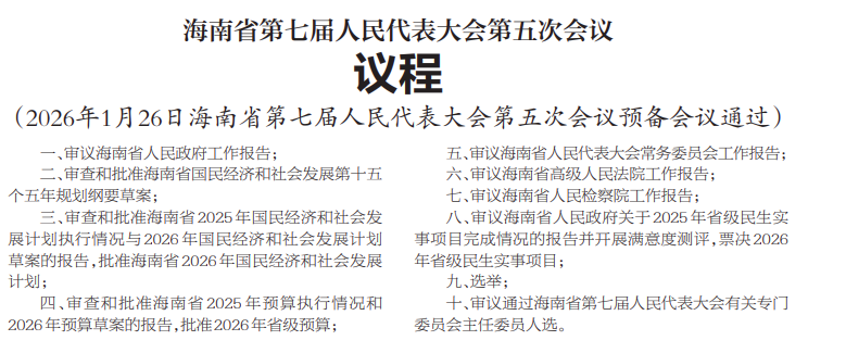 海南省第七届人民代表大会第五次会议将于1月27日至31日在海口举行。大会将于27日上午9时在省人大会堂隆重开幕。