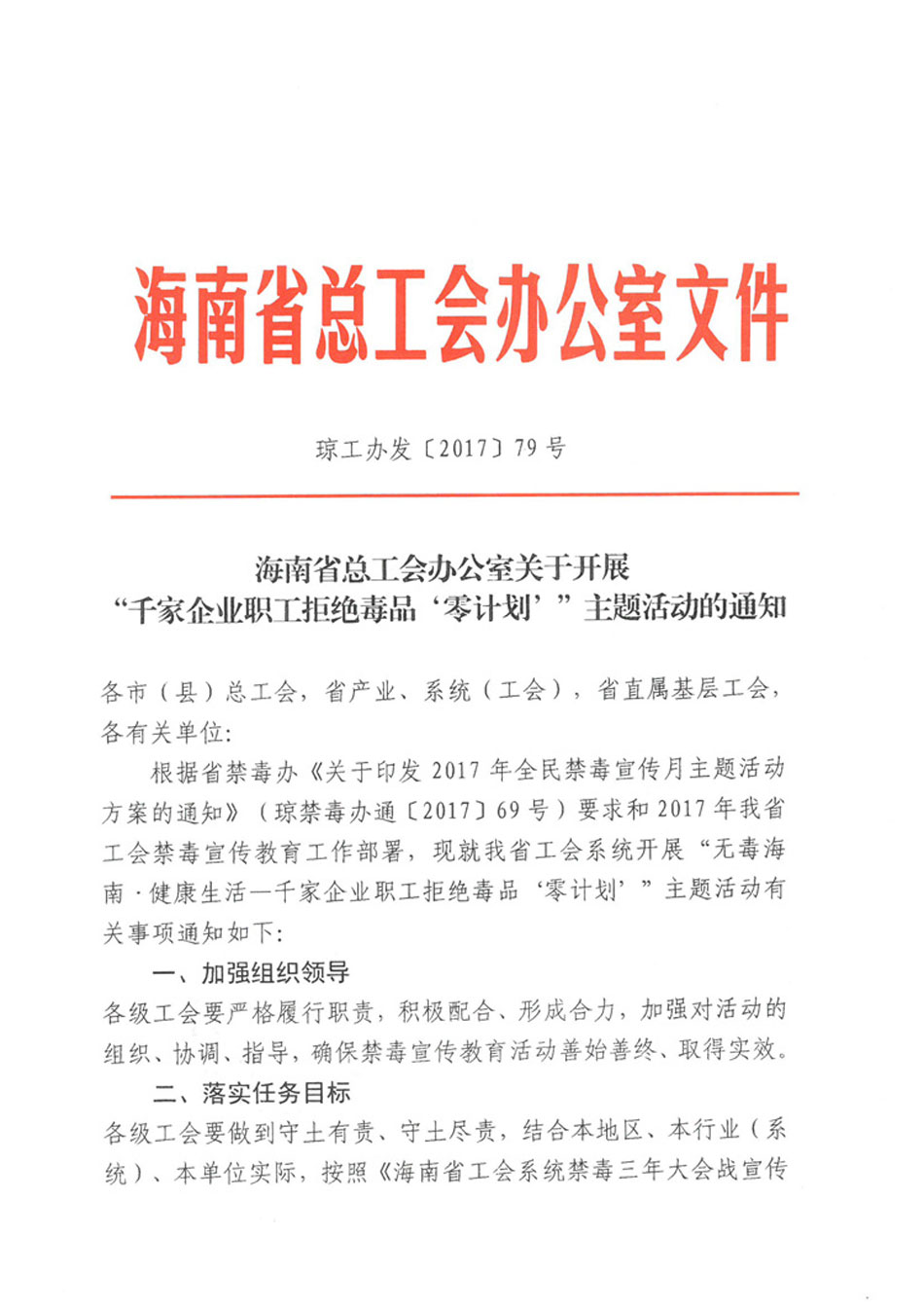 海南省总工会办公室关于开展 “千家企业职工拒绝毒品‘零计划’”主题活动的通知
