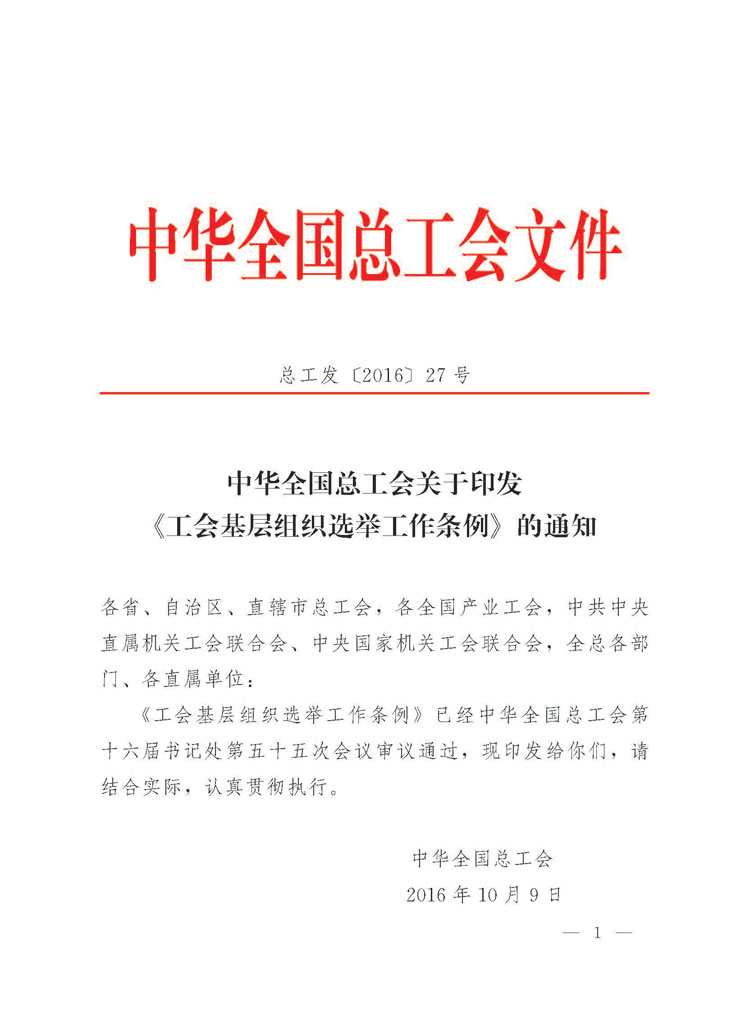 中华全国总工会关于印发《工会基层组织选举工作条例》的通知(总工发〔2016〕27号)